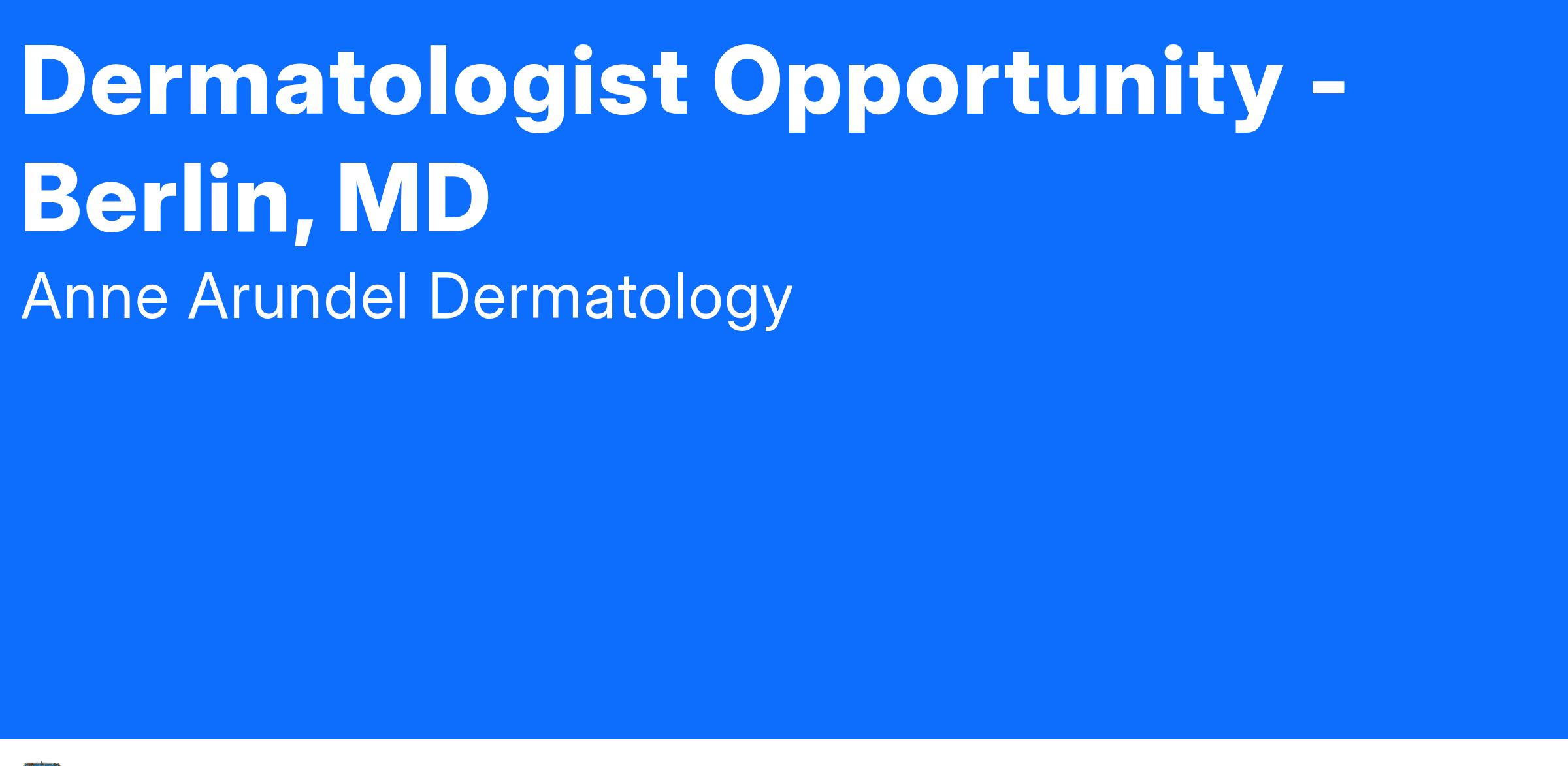 Anne Arundel Dermatology, P.A., is a large Dermatology group practice with a network in 7 states. We have been serving patients for over 50 years and are currently seeking a BC/BE Dermatologist to join our team in Berlin, MD just minutes from the beautiful beaches on the Eastern Shore of Maryland, and within driving distance to Baltimore, Washington, DC & Annapolis, MD.